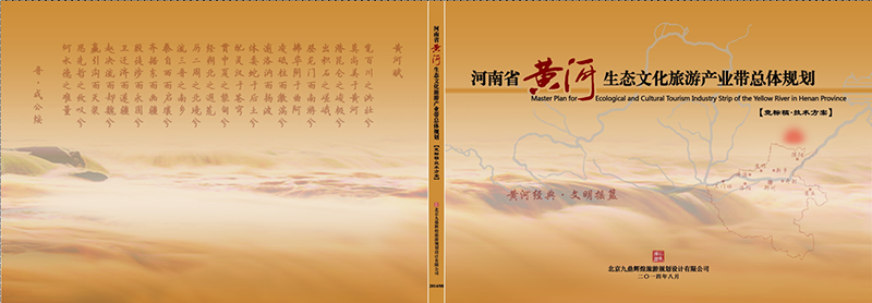 我做封面选用的元素一般是规划范围和湖泊山河,比如河南黄河生态文化旅游产业带这个项目。因为是河南省的,所以图片为河南省的地图,上面包含了黄河流经的线路,封面配上黄河大背景及宣传标语,封底配有黄河赋。整个封面的色彩以黄河图片为基调。